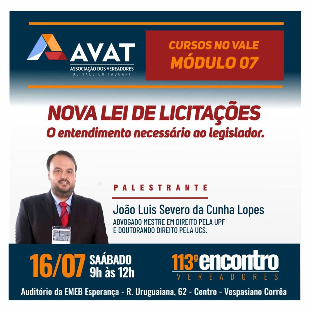 9:30 " Nova Lei de Licitações" com - JOÃO LUIZ SEVERO DA CUNHA LOPES, Advogado Mestre em Direito pela UPF e Doutorando Direito pela UCS.